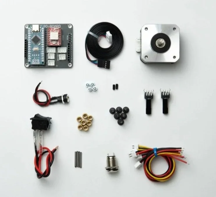 The parts kit includes all essential electronics, screws, and mechanical components needed to build PEDRO. This covers the motors, wiring, power supply, fasteners, and the control board. You only need to 3D print the housing parts yourself.
