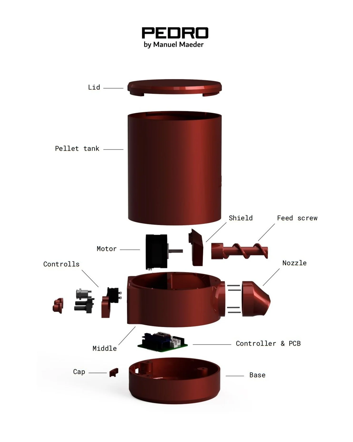 PEDRO is a small DIY machine built around an Arduino Nano that can store and release set portions of pellets or dry food. It is not a polished commercial product but a hobby project designed for makers and pet owners who enjoy building their own tools. The goal is to make a daily task like feeding pets easier while showing how simple electronics and 3D printed parts can come together in a practical project.